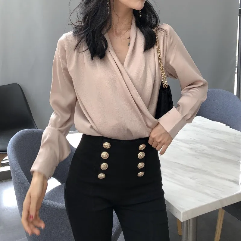 Special Offer Głębokie dekolt w serek kobiety koszula Pure kolorowe topy jesień lato wiosna kobiet z długim rękawem elegancka bluzka dla pań biurowych Discount 25% Today!