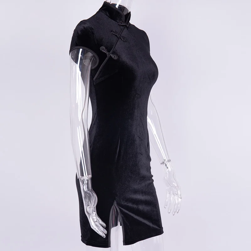 . (Zniżka 43%) Skup Tanie InstaHot w stylu chińskim aksamitna suknia w stylu Qipao kobiety Bodycon Vintage Retro z krótkim rękawem Split Mini tradycyjna dama elegancka Qipao Ceny.