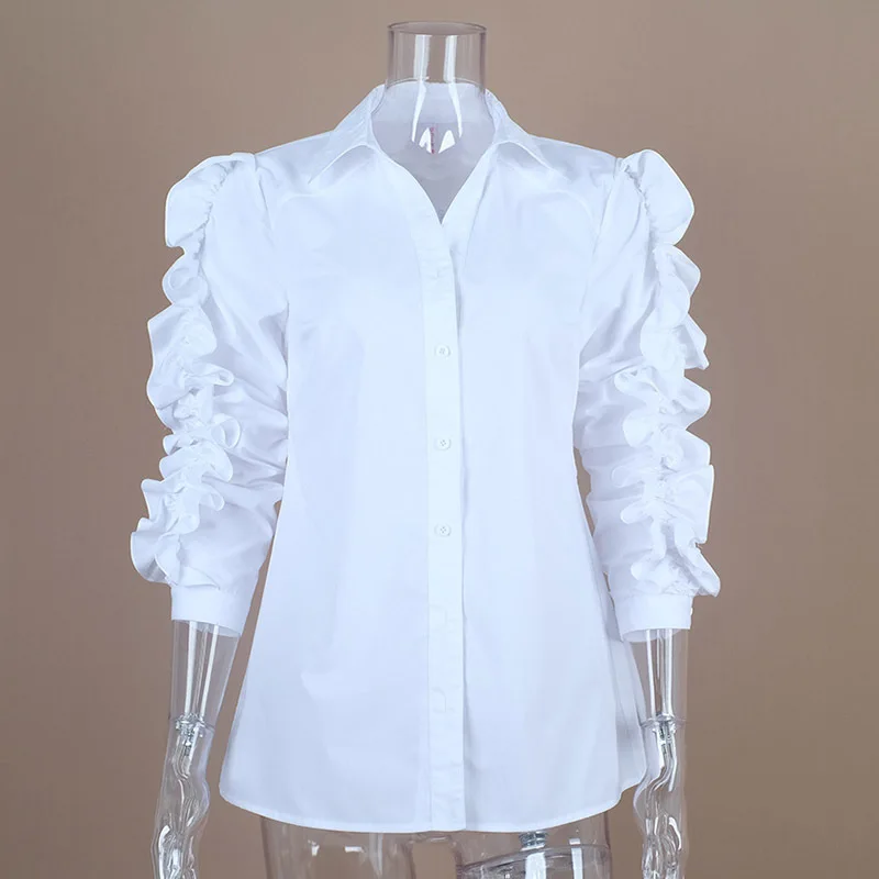 Product Name: TWOTWINSTYLE bluzka z marszczonymi rękawami kobieta z kołnierzykiem z klapami Patchwork biała koszula z długim rękawem topy dla pań 2019 wiosna OL ubrania vintage